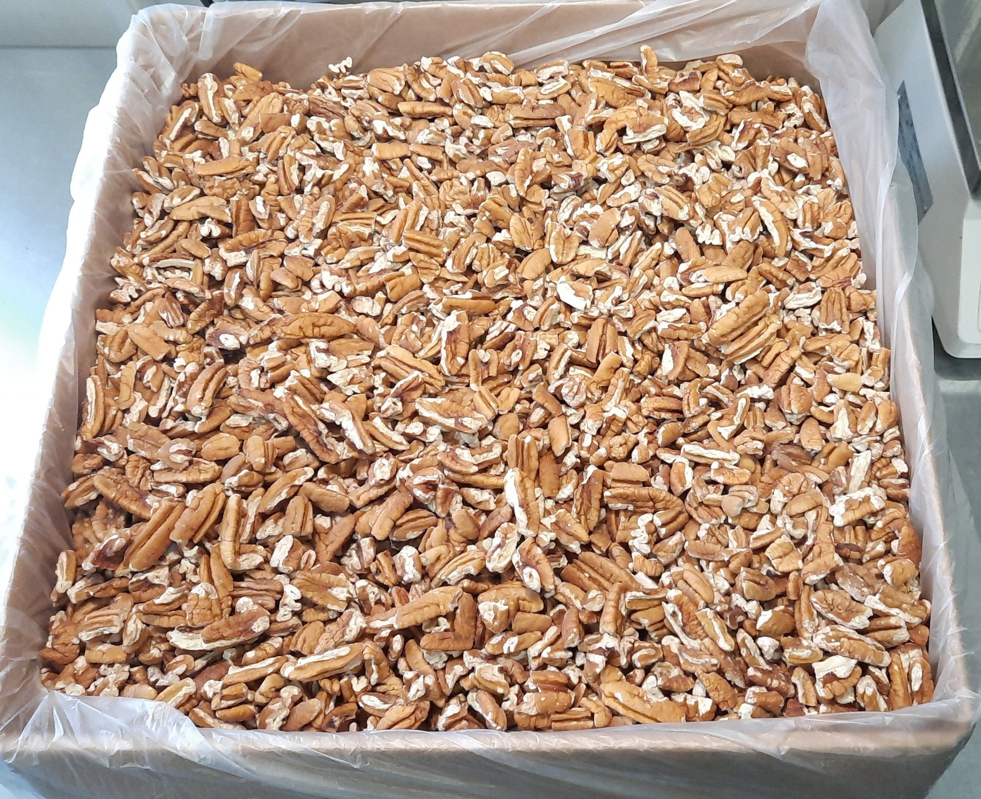 One bulk case of our New Crop premium Papershell Pieces. The pecans are all in one box with a plastic liner containing them.