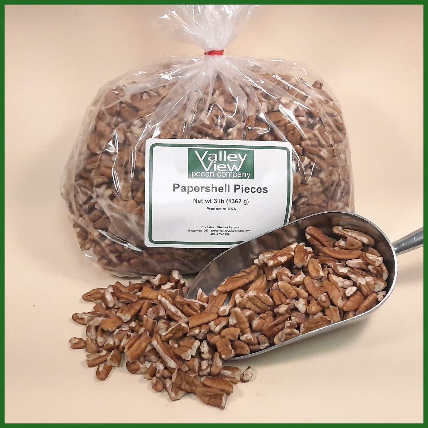 One 3 lb bag of our premium Papershell Pecan Pieces, bagged in plastic with a twist tie top. These are a great size for granola and other mixes, where a larger pecan piece is needed. Approximately 12 cups.