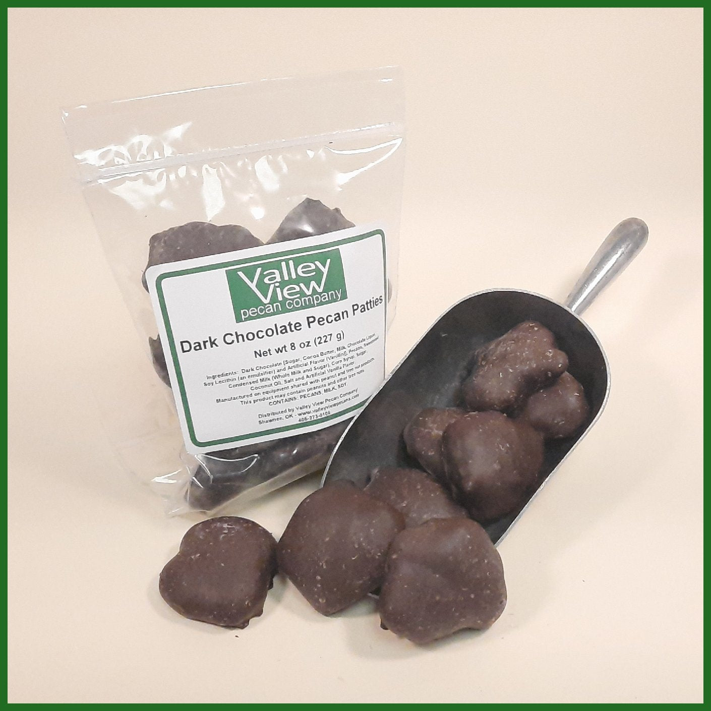 Pecans and dark chocolate with a caramel center. There are around 10 delicious little "turtles" per bag. Approximately 70% dark.