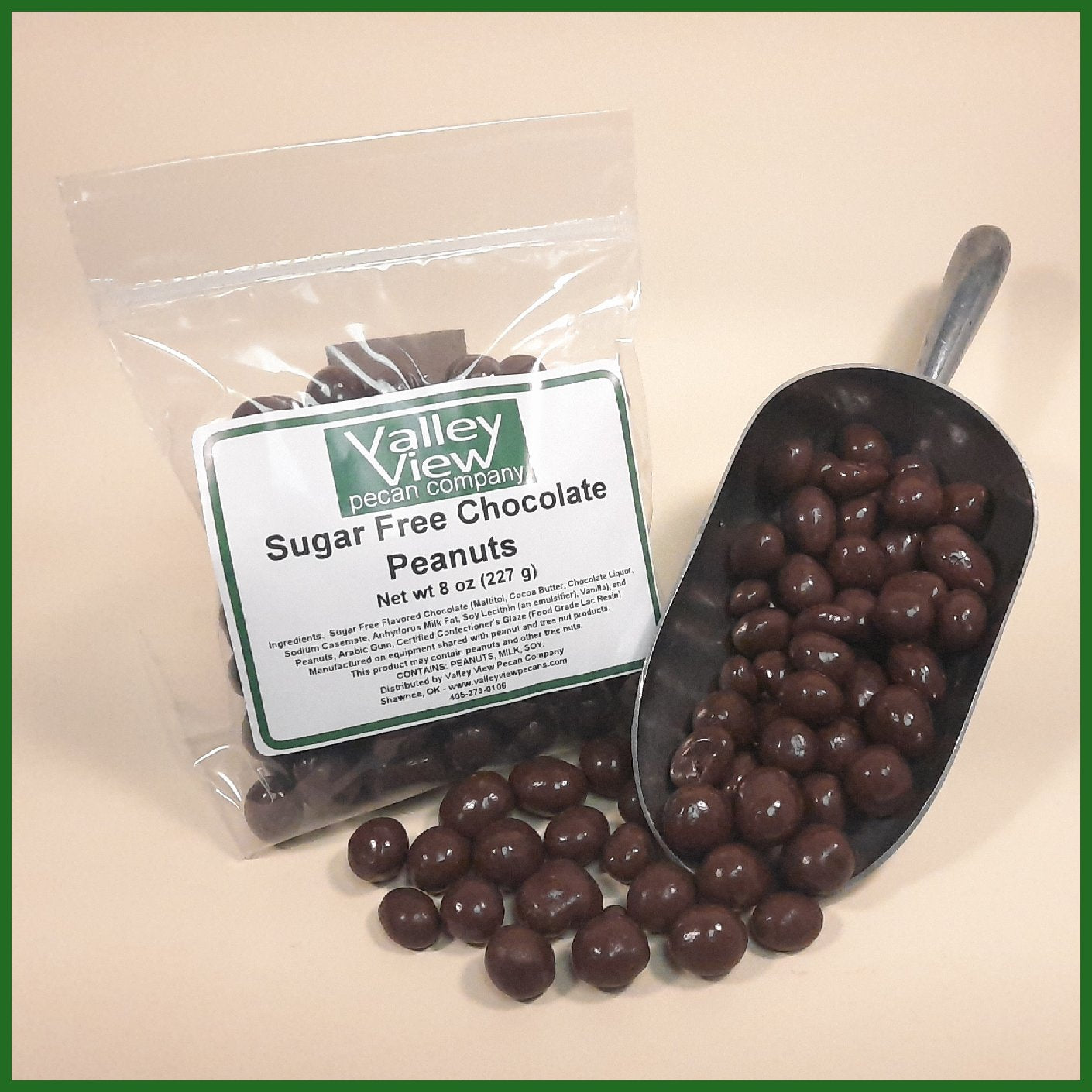 Peanuts coated with sugar free chocolate coating. The sugar substitute is Maltitol.